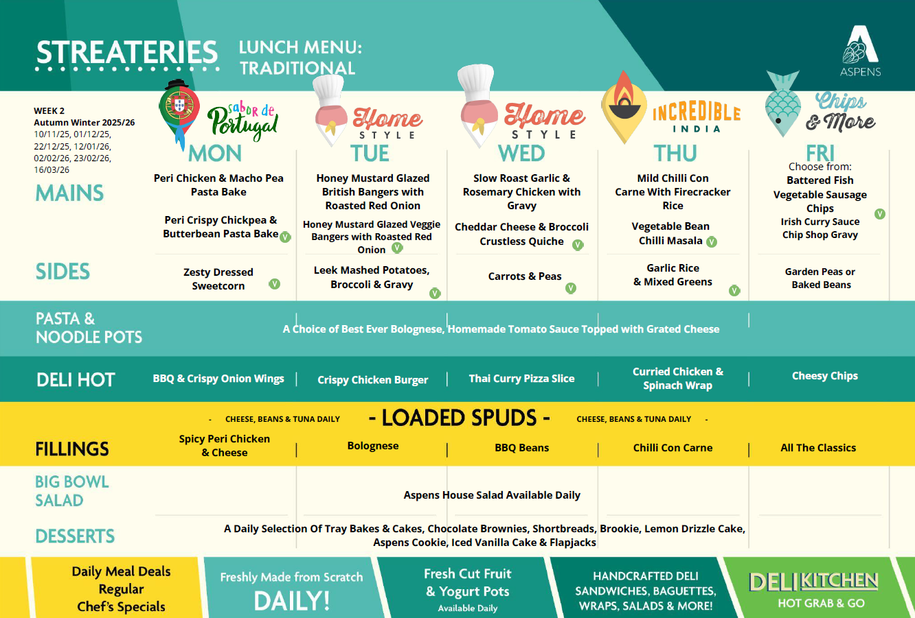 Streateries is our secondary meal offer where everyday has a theme. Featuring Global cuisines, customised offers and food on the move, we are bang up to date with the current trends whilst still ensuring that there is a place on the menu for the comfort of our familiar school dining hall favourites. Each day the menu includes as standard a street food dish, a hand held version, vegetarian/vegan choices along with a selection of sides.