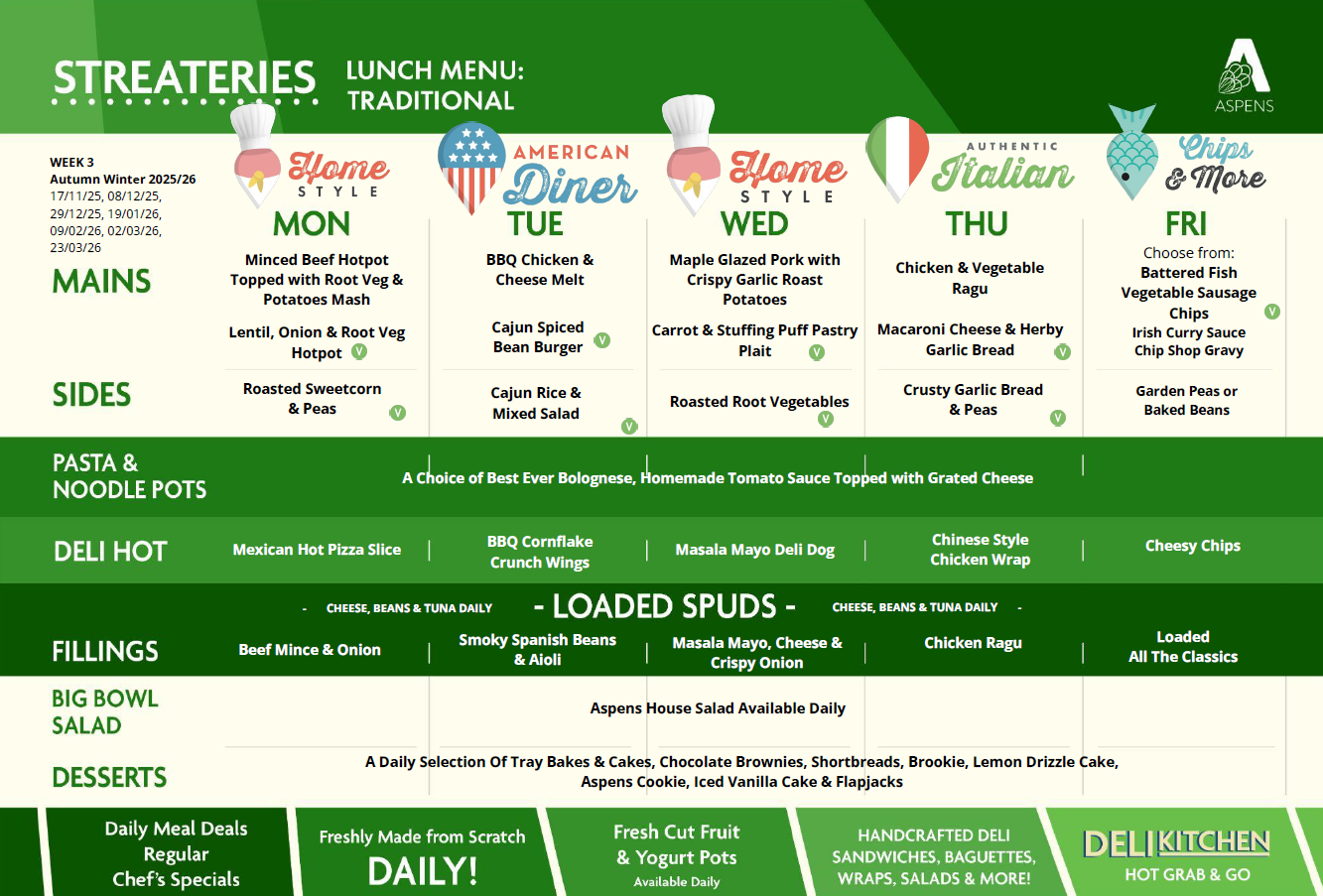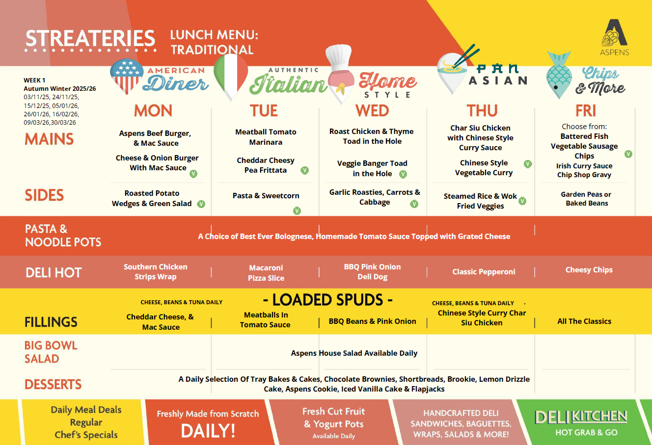 Streateries is our secondary meal offer where everyday has a theme. Featuring Global cuisines, customised offers and food on the move, we are bang up to date with the current trends whilst still ensuring that there is a place on the menu for the comfort of our familiar school dining hall favourites. Each day the menu includes as standard a street food dish, a hand held version, vegetarian/vegan choices along with a selection of sides.