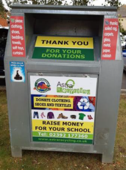 We have a textile recycling bin just inside the college gates. FoStA receives money for all donations.